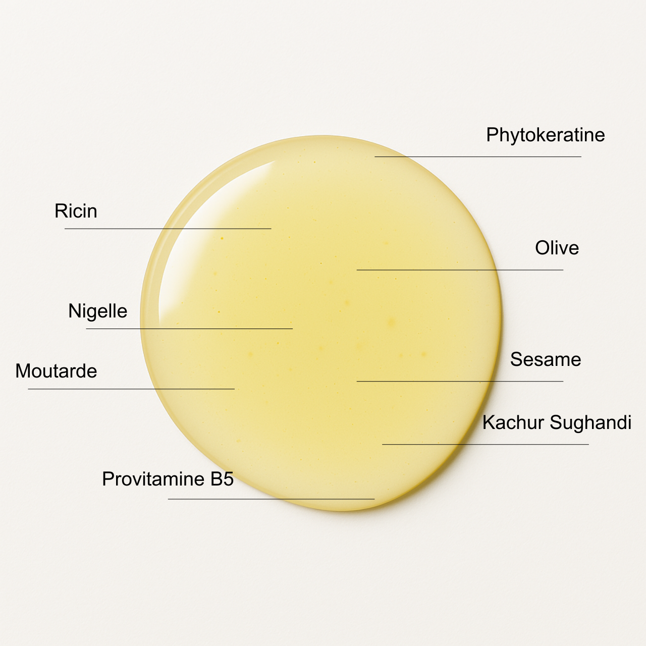 INCI : VITIS VINIFERA SEED OIL, RICINUS COMMUNIS SEED OIL , SESAMUM INDICUM SEED OIL, NIGELLA SATIVA SEED OIL, OLEA EUROPAEA FRUIT OIL, BRASSICA NIGRA SEED OIL, HYDROLYZED WHEAT PROTEIN, PANTHENOL, AQUA, KAEMPFERIA GALANGA ROOT EXTRACT , CITRIC ACID
