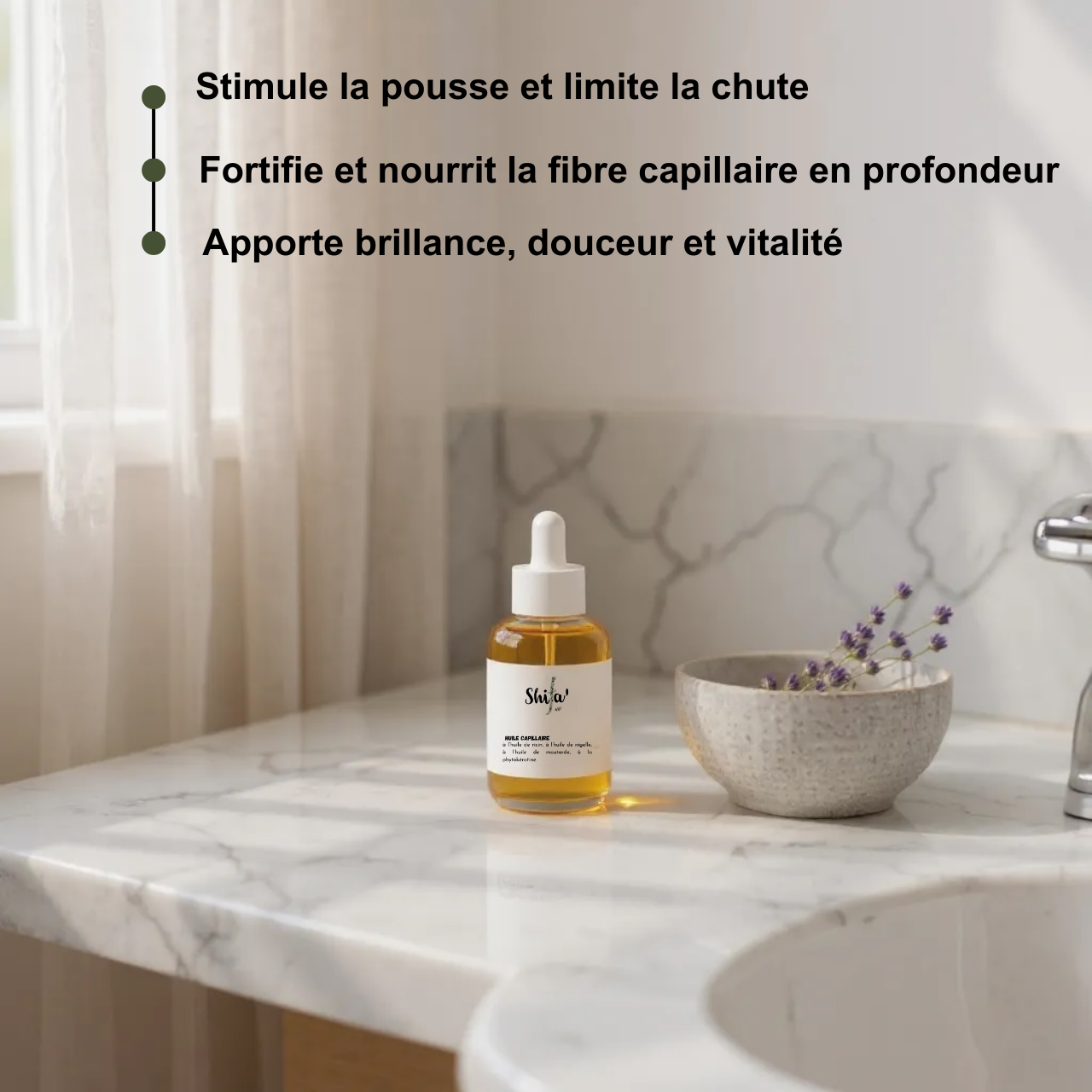 Pour une hydratation optimale, nous avons intégré l’huile d’olive, riche et adoucissante, et l’huile de moutarde, reconnue pour stimuler la circulation sanguine et soutenir la pousse. À cette base végétale s’ajoutent des actifs puissants : la phytokératine, qui répare et renforce la fibre capillaire, la provitamine B5, qui hydrate et protège les cheveux contre la casse, et enfin l’extrait d’ashwagandha, connu pour ses vertus apaisantes et anti-inflammatoires sur le cuir chevelu.